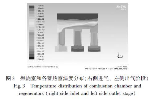量, 因此在豎直方向蓄熱體和氣體都呈現(xiàn)出明顯的溫度梯度。同時(shí), 當(dāng)進(jìn)氣排氣方向發(fā)生變化時(shí), 燃燒室內(nèi)溫度也會(huì)出現(xiàn)波動(dòng), 且分布不均勻。對(duì)于燃燒室結(jié)構(gòu), 也有裝置將燃燒室頂部?jī)蓚?cè)的直角改為切角, 使得煙氣湍流充分, 減小低溫區(qū)出現(xiàn)的可能性