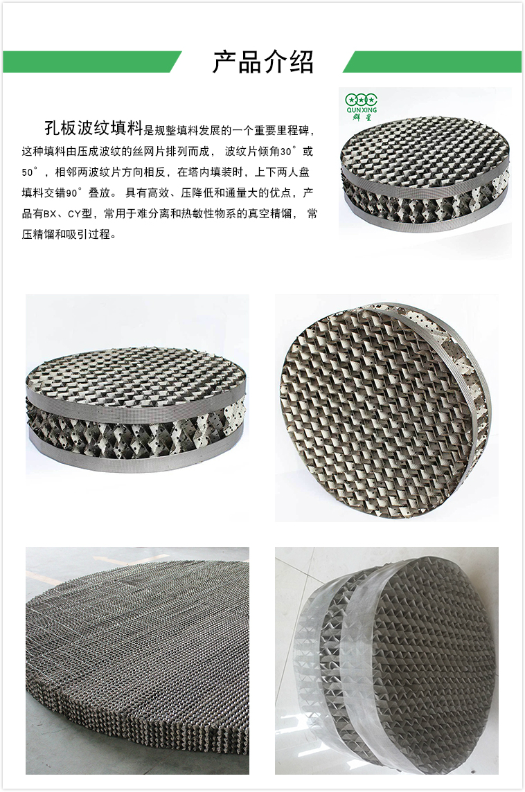重點介紹金屬絲網(wǎng)波紋包裝,它是波紋包裝的主要方式,主要由金屬絲網(wǎng)制成,較常用的有不銹鋼、碳鋼、鋁、銅等,當(dāng)然也可根據(jù)客戶需要選擇其他材料。雖然波紋金屬絲網(wǎng)填料的成本相對較高,但由于其分離能力強、比表面積大、空位率高、阻力小等優(yōu)點而得到廣泛應(yīng)用,特別是用于精細(xì)蒸餾和真空蒸餾設(shè)備,以及熱敏性材料的蒸餾。